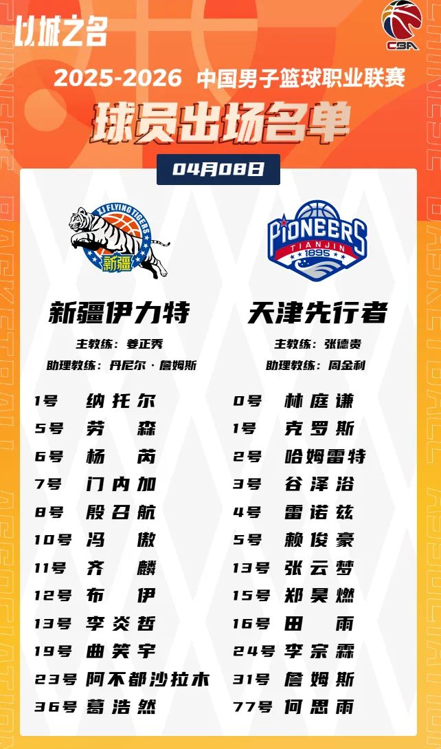 虎扑04月08日讯 今日CBA常规赛,新疆对阵天津的大名单已经出炉。